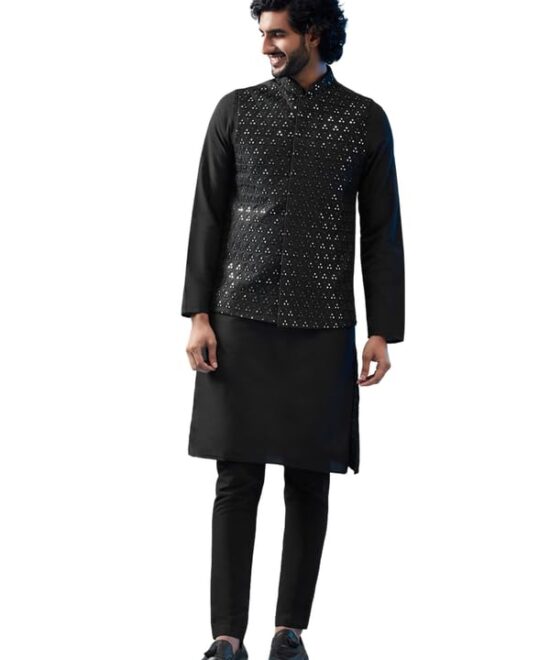 KISAH Men’s Kurta Jacket Trouser Set, Black Art Silk, Embellished Regular Fit Long Sleeves Mandarin Collar (L)