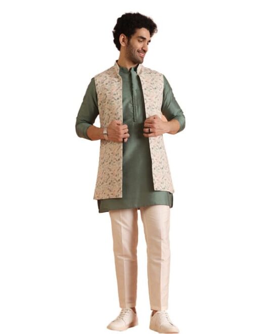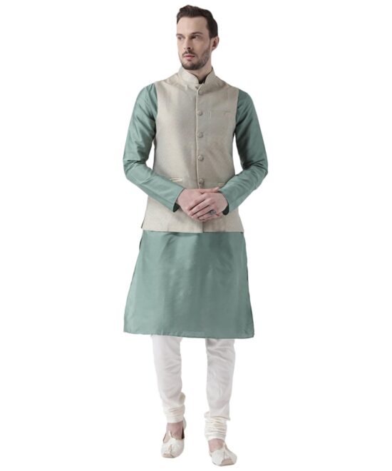 KISAH Men Green Cream Solid Banarasi Kurta with Churidar Nehru Jacket, Full Sleaves, Knee Length, Straight, Regular Fit, Mandarin Collar Ethnic wear