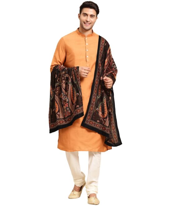 KISAH Men’s Rust Kurta Set with Dupatta Cotton Blend Fabric Full Sleaves, Knee Length, Mandarin Collar Ethnic wear, L