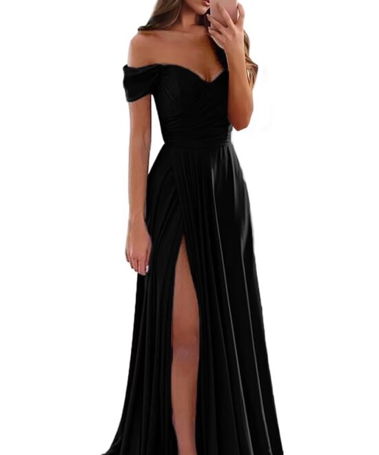 GODCUN Off Shoulder Prom Dresses for Women Satin Formal Dress A Line Long Evening Party Gowns with Slit, Black, 8