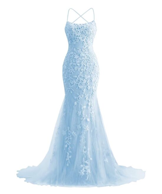 Homdor Mermaid Prom Dresses 2025 Spaghetti Straps Evening Gowns Lace Applique Floral Formal Straight, Floor Length Dresses For Women, Sky Blue