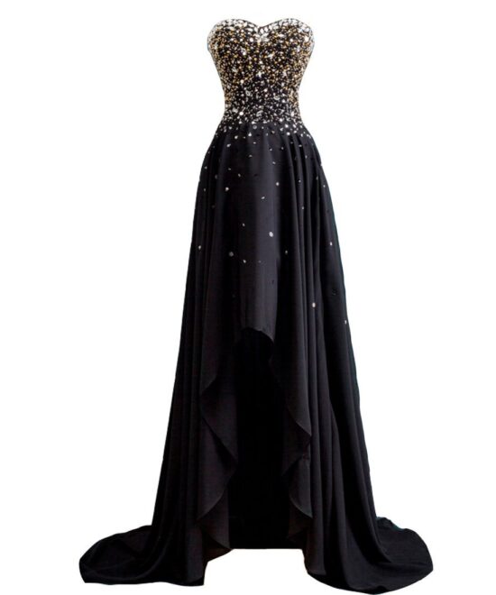 Kivary Women’s Black and Gold Beaded High Low Chiffon Formal Prom Dresses Evening Gowns US 2