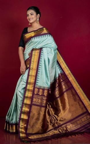 Bengal Looms India – Handwoven Micro Checks Gadwal Silk Saree in Arctic Blue, Black, Wine, Dark Green and Golden Zari Work with Blouse Piece