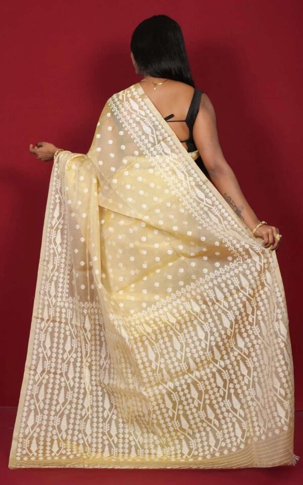 Bengal Looms India’s Traditional Needle Karat Nakashi Motif Work Muslin Silk Dhakai Jamdani Saree in pastel yellow and off-white is a masterpiece of heritage craftsmanship and timeless elegance. The saree is crafted from premium muslin silk, known for its soft texture and lightweight feel, which drapes gracefully around the body. The intricate Needle Karat Nakashi motif work, which is traditionally handwoven, adorns the fabric in beautiful patterns, showcasing the skill and artistry involved in the creation of this saree. The combination of pastel yellow and off-white creates a subtle yet striking contrast, making it perfect for a variety of occasions, from festive celebrations to intimate gatherings. Accompanied by a matching blouse piece, this saree allows for personalization to create a complete look. The fine details of the Nakashi motifs are carefully incorporated into the design, elevating the beauty of the saree and creating a harmonious ensemble. The Dhakai Jamdani weave, with its rich cultural heritage, adds depth and texture to the fabric, making this saree not just a piece of clothing but a work of art. Ideal for those who appreciate the artistry of traditional handloom weaves, this saree is a statement of sophistication, elegance, and cultural pride.
