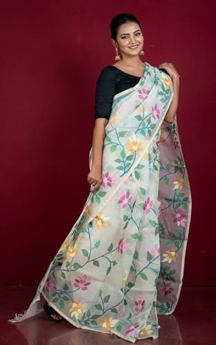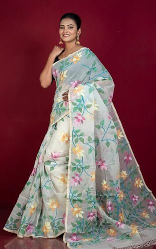Bengal Looms India-Soft Quality Jangla Jaal Lotus Motif Work Muslin Silk Dhakai Jamdani in Daisy White, Beige and Multicolored Thread Work With Blouse Piece