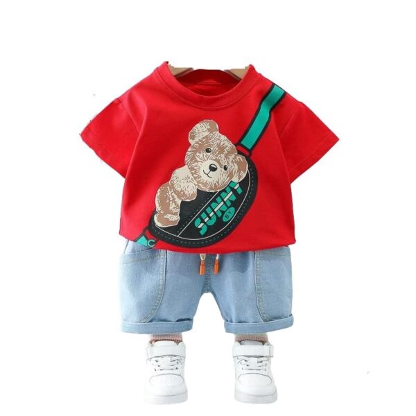 - Item includes: 1 Red T-shirt for Boys Kids with 1 Blue Denim Shorts, Material: 100% Cotton