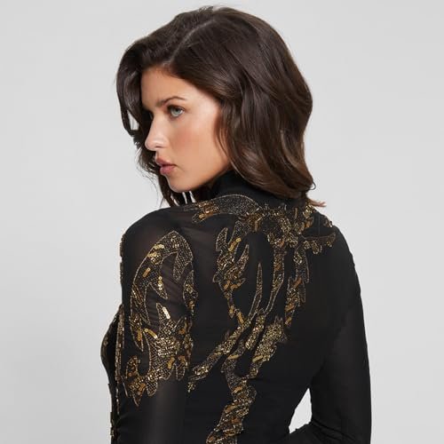 The GUESS Women’s Black Embellished Bodycon Dress combines a sleek silhouette with elegant detailing. Featuring a mock neckline, full sleeves, and subtle embellishments, this dress is perfect for evening parties, formal dinners, or upscale events.