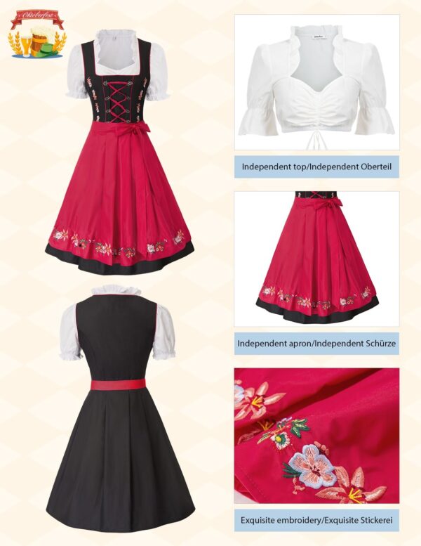 JASAMBAC Women’s German Dirndl Dress Costumes 3 Pieces for Oktoberfest Carnival, Red, Large