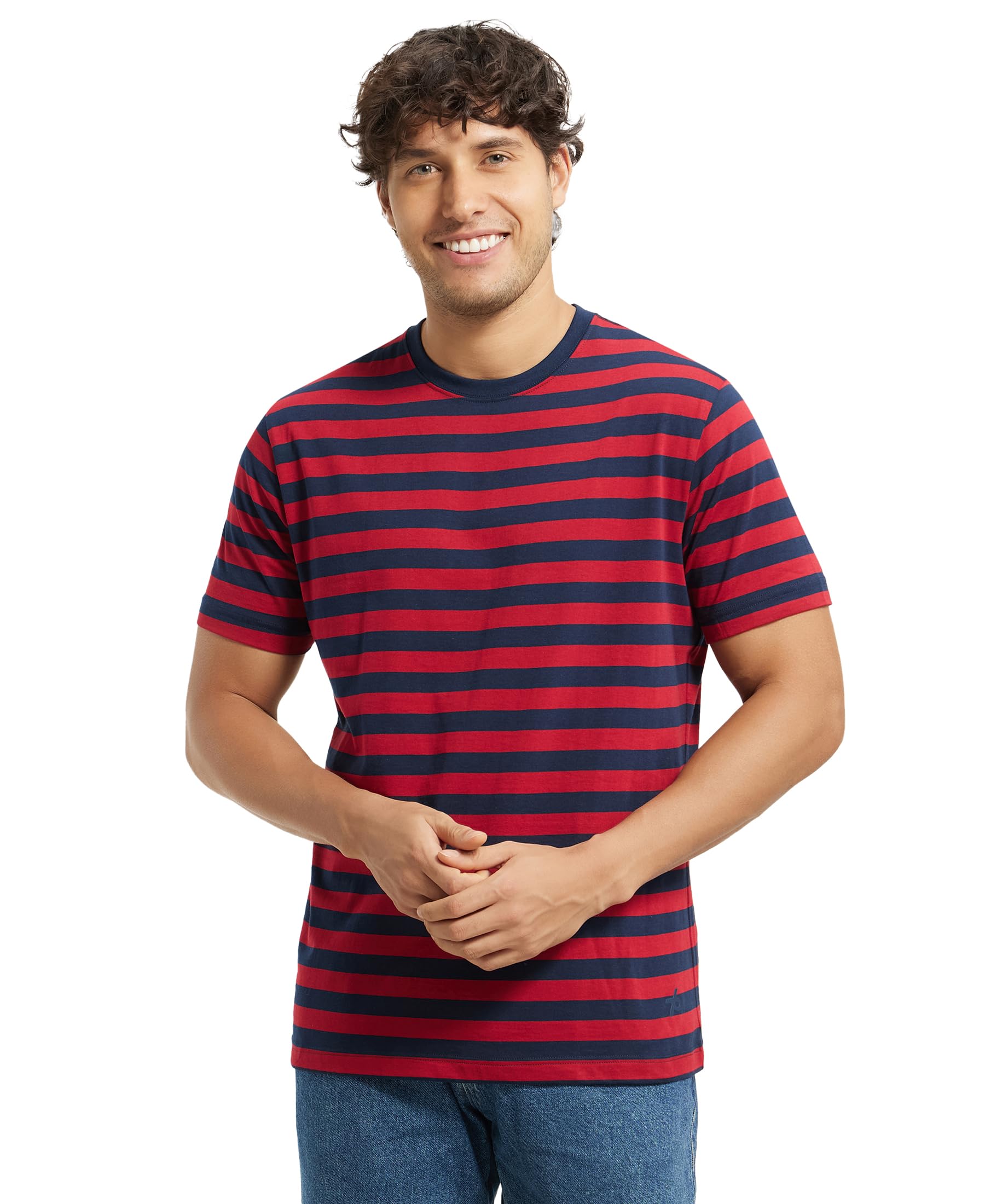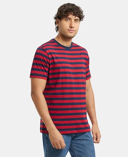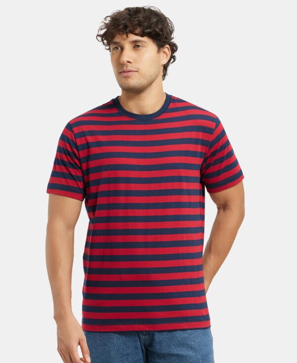 Super combed Cotton Rich fabric. Ribbed round neck to prevent sagging. Half sleeve T-shirt with yard dyed striped pattern. Regular fit. Label free for all day comfort.