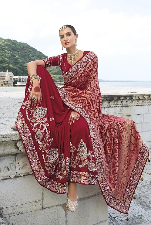 NONITA FASHION Maroon Net Saree with Sequin Embroidery, Designer Wedding Saree with Blouse Piece