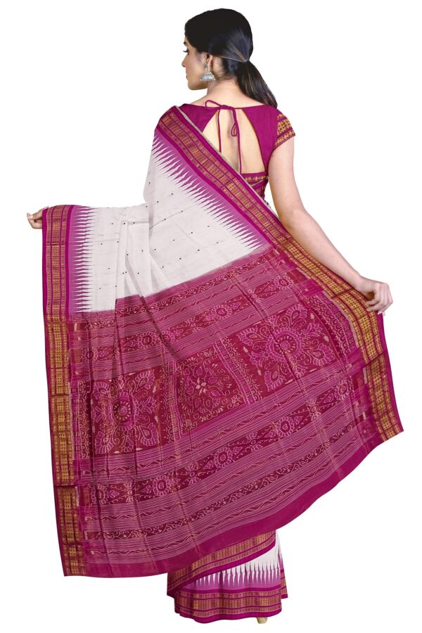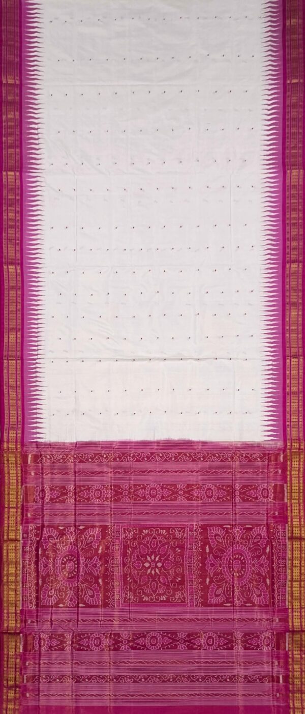 - DESIGN PATTERN: White base saree featuring elegant mini buti design in pink colour, complemented with traditional Sambalpuri patterns on the pallu