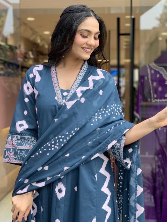 Rangnavi Women’s Cotton Anarkali Printed V-Neck Kurta with Palazzo & Dupatta | Ethnic Set | Dupatta Set | Suit Set |Kurta Set |