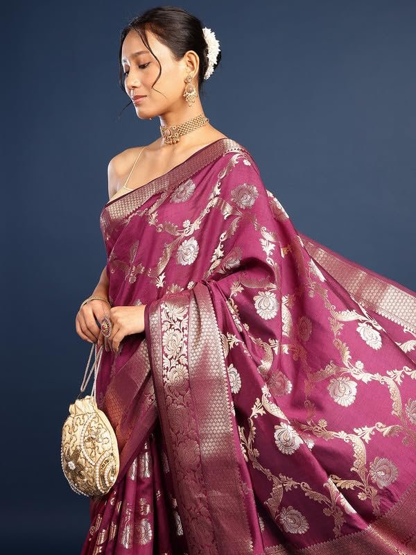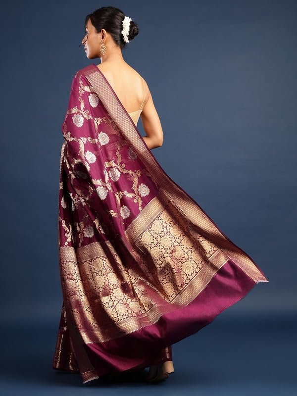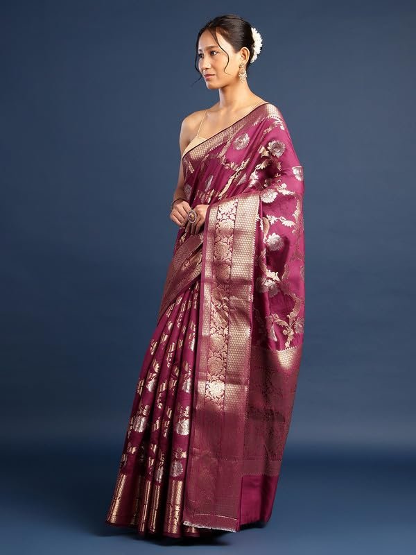• Weaving Style: Handwoven Banarasi saree with detailed zari work showcasing traditional craftsmanship.