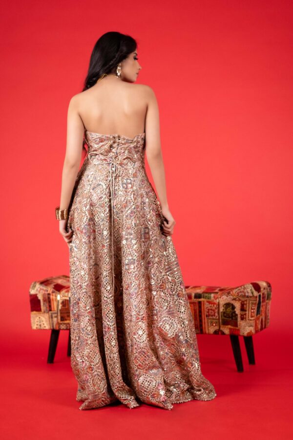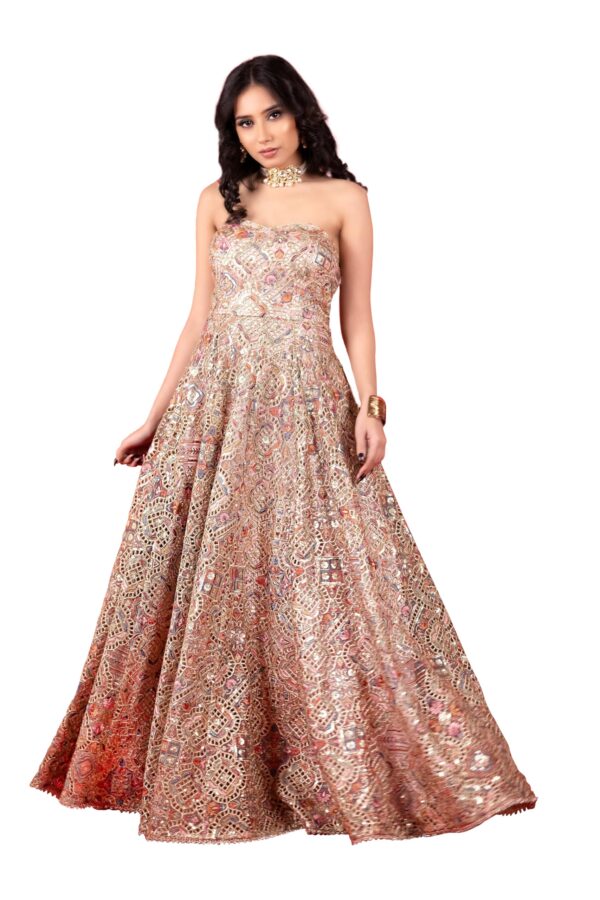 Turn heads with our exquisite shoulderless gown, crafted from embroidered net fabric and designed to perfection. This elegant piece features intricate heavy embroidery that adds a touch of luxury and sophistication, making it an ideal choice for a glamorous evening.