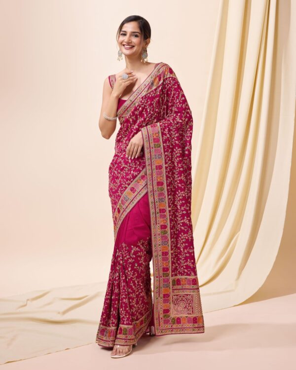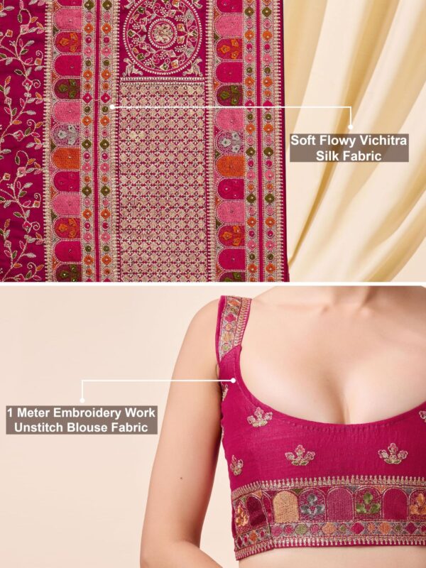 This TRENDMALLS Vichitra Silk Saree blends luxurious fabric with detailed embroidery and shimmering Siroski stone accents. Perfect for weddings, parties, and festive occasions, it offers a traditional yet glamorous aesthetic with the flexibility of an unstitched blouse piece.