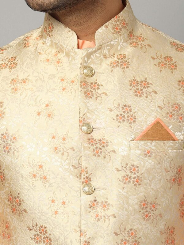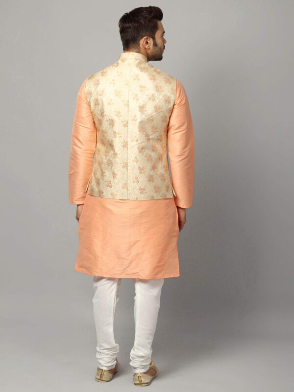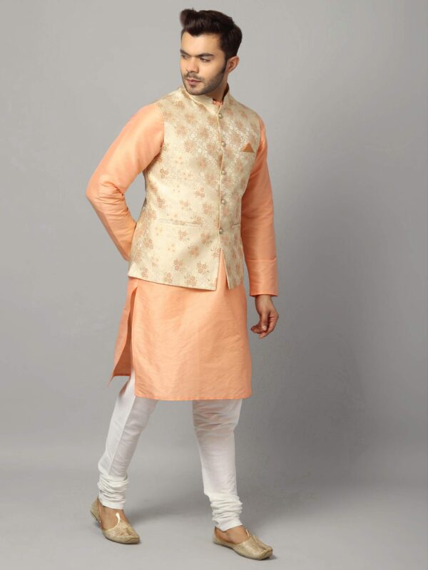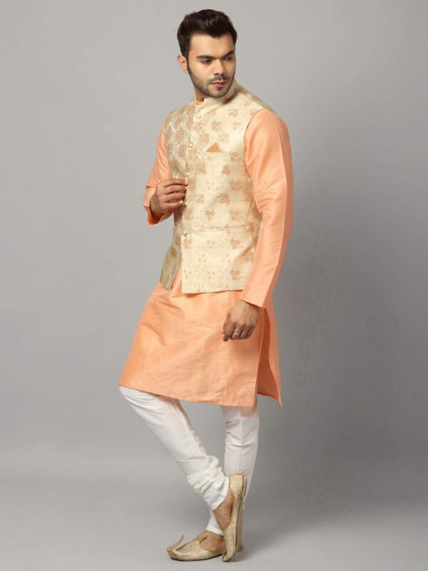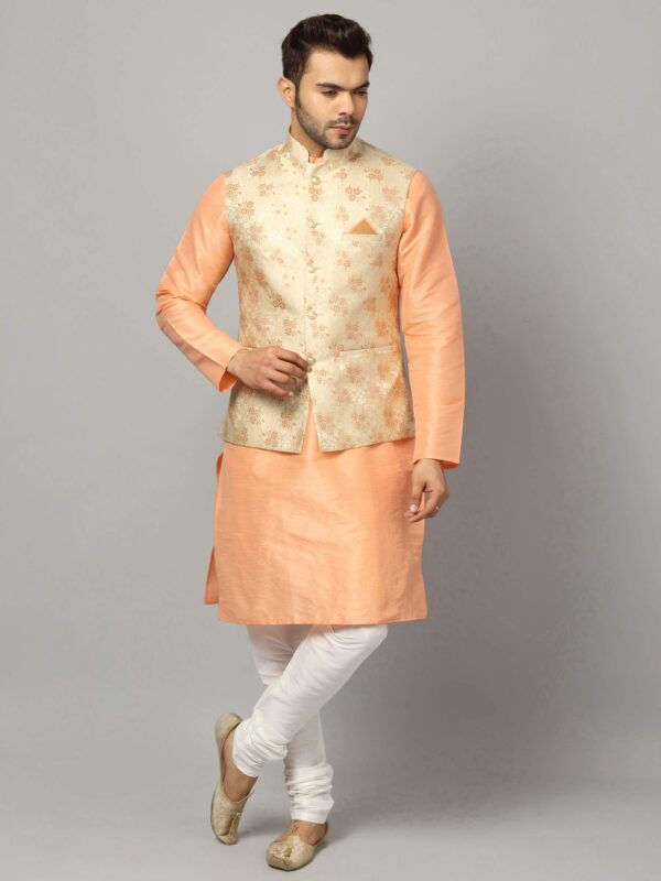 Uri and MacKenzie Men’s Silk Blend Solid Kurta Set Churidar Pyjama with Stylish Nehru Jacket/Waistcoat (Large, Cantaloupe/White)
