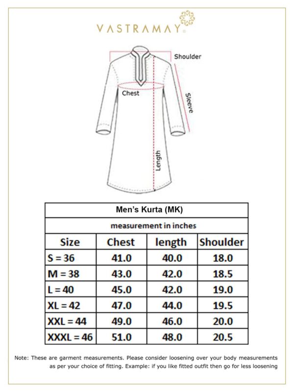 - All our kurtas have five inches loosening over the body measurement. So if your chest round measurement is 38 inches then you should go for a 38 (Medium) size Kurta which will have a garment ready chest measurement of 43 inches. We offer six sizes – Small = 36 (Chest – 41), Medium = 38 (Chest – 43), Large = 40 (Chest – 45), X- Large = 42 (Chest – 47), XX – Large = 44 (Chest – 49) and XXX – Large = 46 (Chest – 51).
