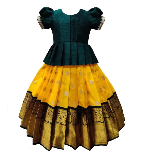 White Button New south Indian traditional pattu pavadai Jecquard Lehenga choli for girls dress (7-8 Years, Green,Yellow)